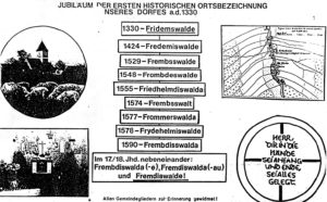 Fremdiswalde ist eine deutsche Ansiedelung. Darauf deutet schon der Name. Der erste Teil des Ortsnamens stellt einen deutschen Personennamen dar, freilich unbestimmt, ob Fridamund (= Friedensschützer, Fremdiswalde dann = zu Fridamundis walde), worauf die älteste im Cod. dipl. Sax, bezeugte Form Friedemswalde (1330) weist, oder Fredemot (= friedenssinn), wovon sich die 1424 vorkommende Form Fredemiswalde ableiten lässt, oder endlich Friedhelmdiwalda herrührt, die, wie eine Notiz in der noch vorhandenen Schulmatrikel von 1741 besagt, noch 1555 gebraucht worden ist. In den Visitationsakten der Superintendentur Grimma von 1529 wird der Name Frembsswalde geschrieben und in denen von 1574 Frembsswald. Es sind das die ersten Anfänge der im 19. Jahrhundert alleinherrschend gewordenen verstümmelten Form Fremdiswalde. Im 17. und 18. Jahrhundert finden sich nebeneinander die Schreibweisen Frembdiswalda, Frembdiswalde, Fremdiswalda und Fremdiswalde.