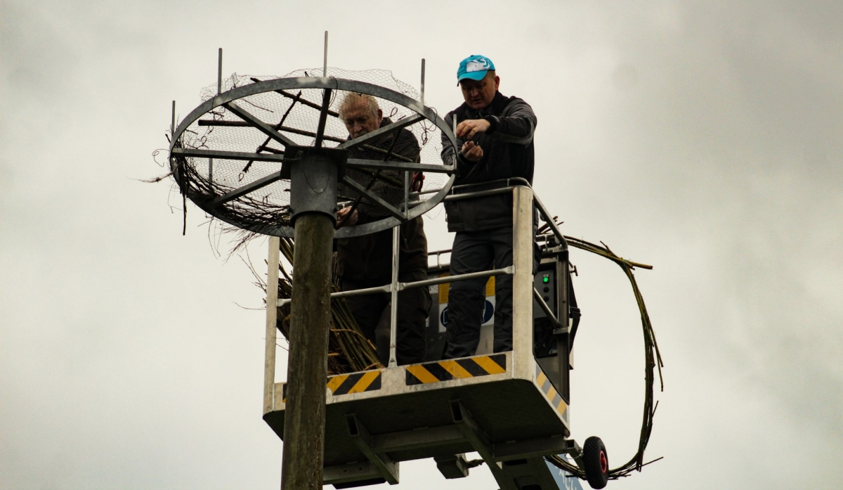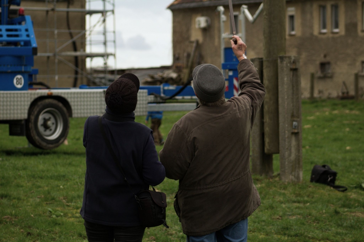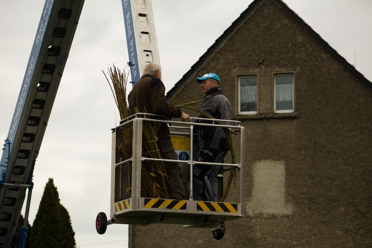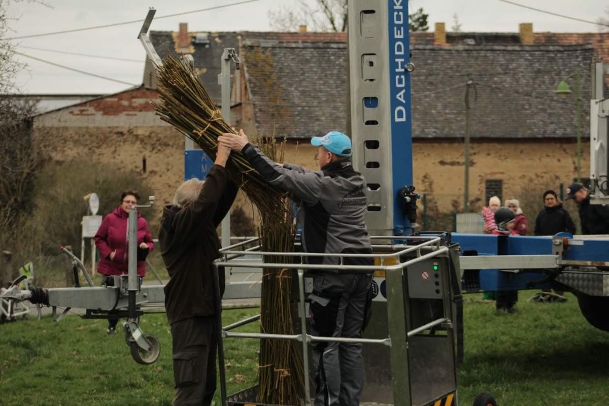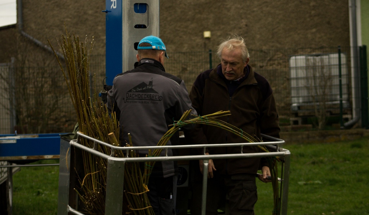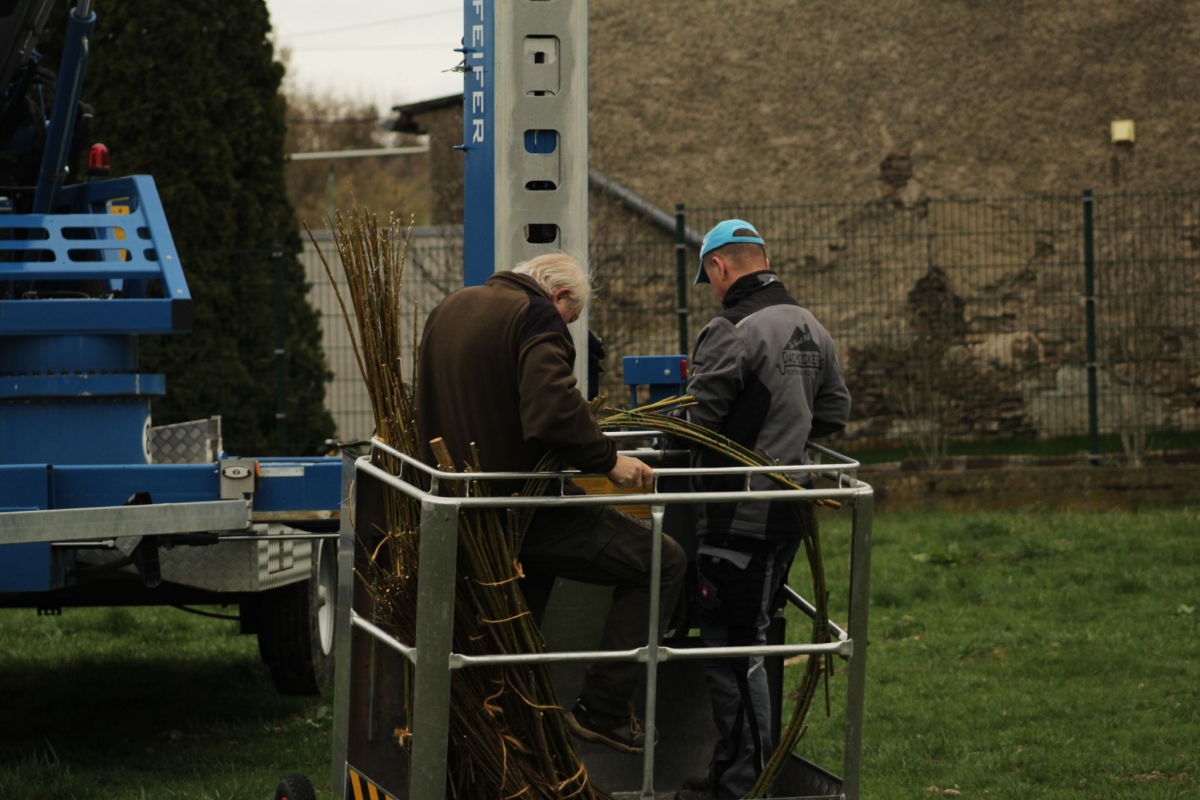 „Vor etwas mehr als einem Jahr haben Ute Kniesche und ich festgestellt, dass es seit langer Zeit keine Störche mehr in Fremdiswalde gibt. Kurz darauf haben wir uns mit vielen netten Menschen in Verbindung gesetzt, darunter auch Herr Holfter der sich bestens mit Störchen auskennt. Er hat uns gesagt, dass es tatsächlich möglich ist, wieder Störche nach Fremdiswalde zu locken, es jedoch eine etwas aufwendige Sache ist. Davon ließen wir uns aber natürlich nicht aufhalten und am 26. 03. 2023 hat Herr Holfter in Zusammenarbeit mit René Pfeifer die Nisthilfe oben auf das Storchennest gebaut.